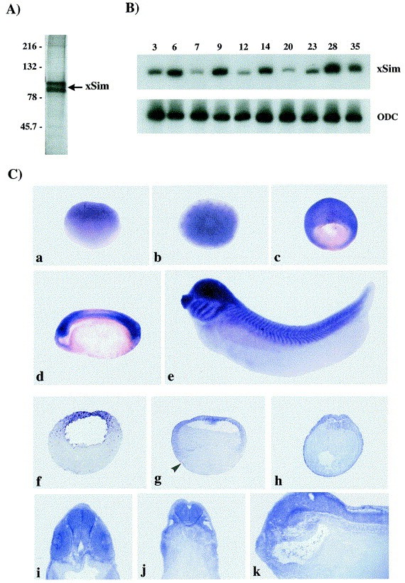 Fig. 2. (A) In vitro translation of xSim. Wild-type xSim protein is expressed by in vitro translation in rabbit reticulysate lysate and assessed by SDS-PAGE and autoradiography after incorporation of 35S methionine. (B) Temporal expression analysis of xSim during Xenopus embryogenesis analyzed by RT-PCR. Embryonic stages tested (Nieuwkoop and Faber, 1967) are indicated above each column. Specific xSim primers (see (Fig. 1) were chosen in the C-terminal region. Signals obtained for xSim was compared with those obtained for ODC. (C) Spatial expression of xSim analyzed by whole-mount and sections in situ hybridizations. (a) Lateral view of stage 6 embryo, vegetal pole is at the bottom. (b) Stage 7 embryo, animal view. (c) Stage 10.5. Dorso-vegetal view. (d) Stage 20. Lateral view, anterior to the left. (e) Stage 35, tail bud embryo, lateral view. (f) Stage 8. Meridian section. (g) Stage 10. Sagittal section. Arrow head indicates the blastopore. (h) Stage 18. Transverse section. (i,j) Stage 30. Transverse sections. (k) Stage 30. Sagittal section.