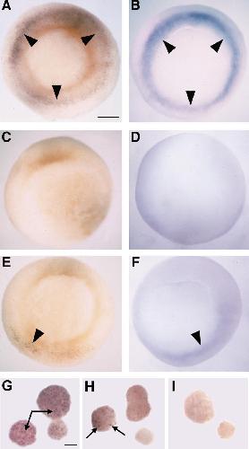 is present in the ectoderm (G, arrowhead) and not in the RLDX-labeled mesoderm (H, arrowhead). Scale bar, 150 mm.