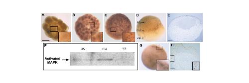 shown here in C and D) activated MAPK expression remains localized to posterior as well as anterior regions of the embryos. (C and D)