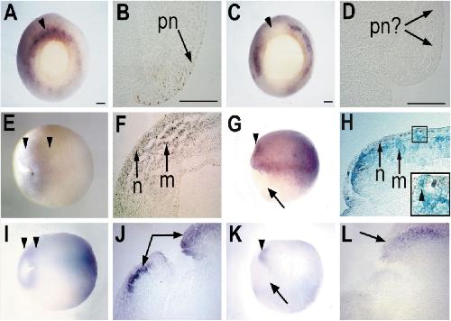 a tail. L shows a sagittal section of a tail-like protrusion expressing Xbra in the posteriormesoderm (arrow). Scale bar, 150 mm.