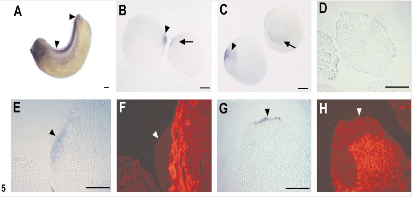arrowhead indicates dorsal). (B) A sagittal section of staining in a late gastrulaembryo (dorsal is on the right and the animal pole is up).