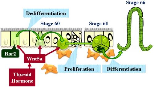 Thyroid hormone-regulated Wnt5a/Ror2 signaling is essential for dedifferentiation of larval epithelial cells into adult stem cells in the Xenopus laevis intestine., PLoS One 2014 |
