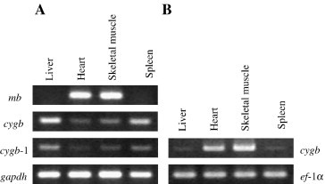 Gene expression and tissue distribution of cytoglobin and myoglobin in the Amphibia and Reptilia: possible compensation of myoglobin with cytoglobin in skeletal muscle cells of anurans that lack the myoglobin gene., Gene 2007 |