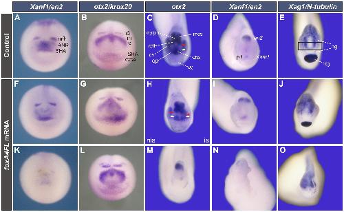 Patterning the forebrain: FoxA4a/Pintallavis and Xvent2 determine the posterior limit of Xanf1 expression in the neural plate., Development 2004 |