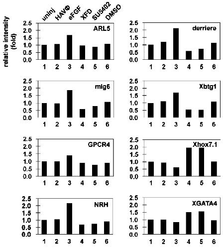 Screening of FGF target genes in Xenopus by microarray: temporal dissection of the signalling pathway using a chemical inhibitor., Genes Cells 2004 |