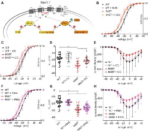 Phosphorylation of a chronic pain mutation in the voltage-gated sodium channel Nav1.7 increases voltage sensitivity.,