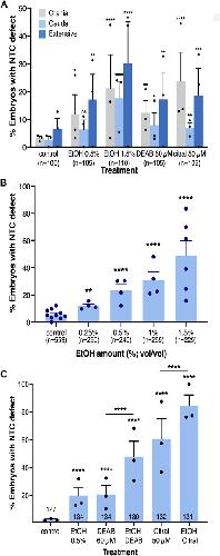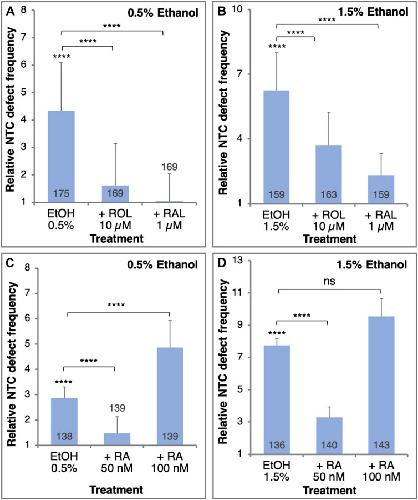 Alcohol induces neural tube defects by reducing retinoic acid signaling and promoting neural plate expansion.,