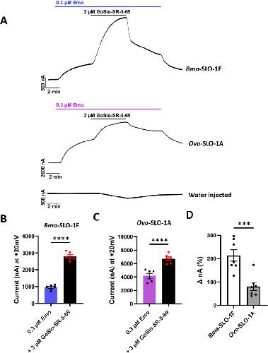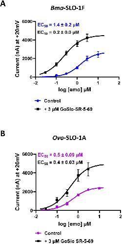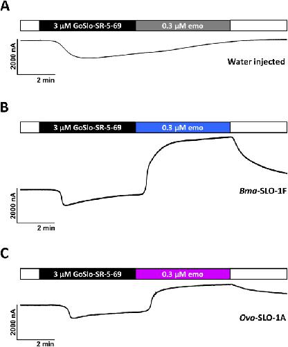 Positive allosteric modulation of emodepside sensitive Brugia malayi SLO-1F and Onchocerca volvulus SLO-1A potassium channels by GoSlo-SR-5-69.,