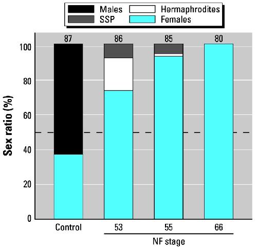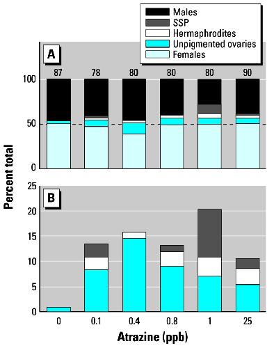 | Hermaphroditic, demasculinized frogs after exposure to the herbicide atrazine at low ecologically relevant doses., Hayes TB,Collins A,Lee M,Mendoza M,Noriega N,Stuart AA,Vonk A, Proc Natl Acad Sci U S A. April 16, 2002; 99(8):1091-6490. |