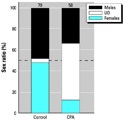 Characterization of atrazine-induced gonadal malformations in African clawed frogs (Xenopus laevis) and comparisons with effects of an androgen antagonist (cyproterone acetate) and exogenous estrogen (17beta-estradiol): Support for the demasculinization/feminization hypothesis.,