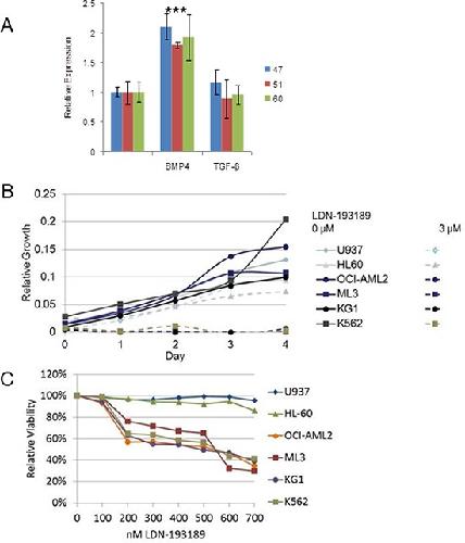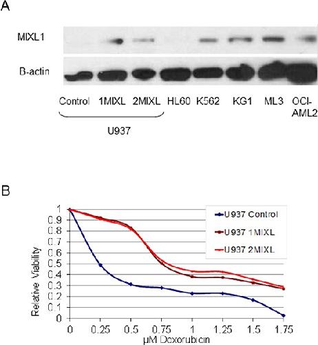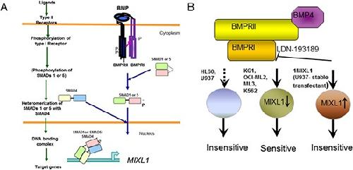A role for BMP-induced homeobox gene MIXL1 in acute myelogenous leukemia and identification of type I BMP receptor as a potential target for therapy.,