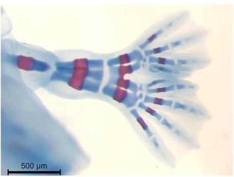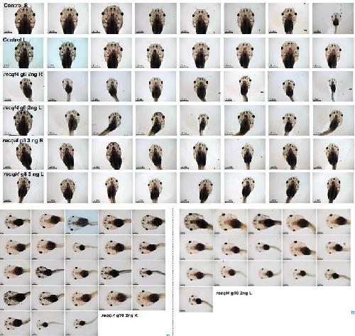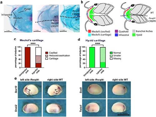 Unilateral loss of recql4 function in Xenopus laevis tadpoles leads to ipsilateral ablation of the forelimb, hypoplastic Meckel's cartilage and vascular defects.,