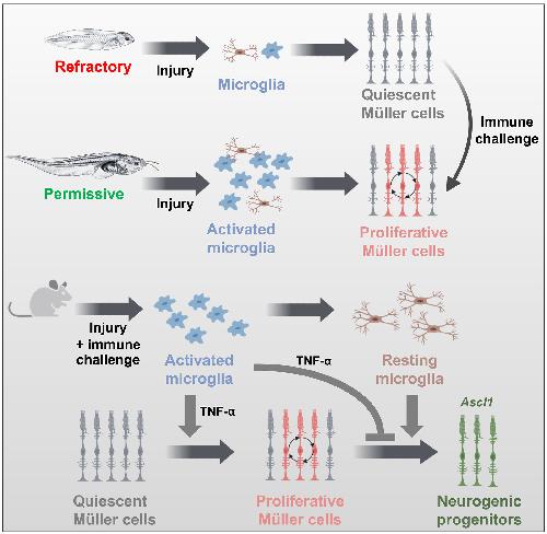 Neuroinflammation as a cause of differential Müller cell regenerative responses to retinal injury.,