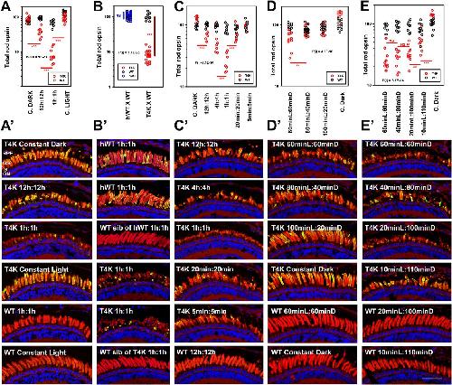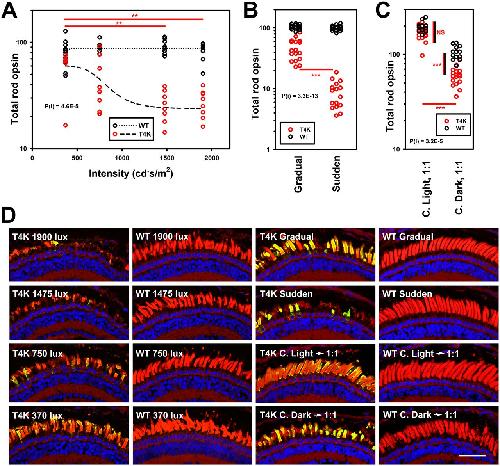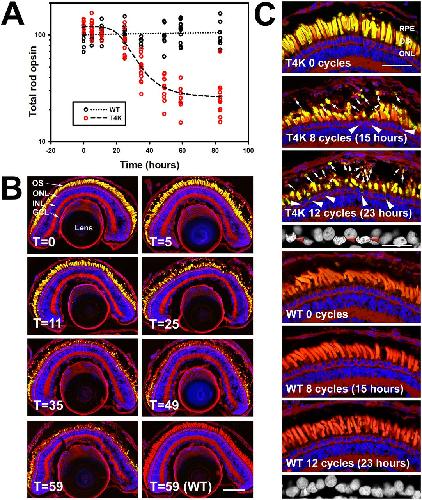 Synchronized Photoactivation of T4K Rhodopsin Causes a Chromophore-Dependent Retinal Degeneration That Is Moderated by Interaction with Phototransduction Cascade Components.,