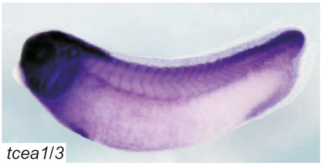 Larger Image tcea1 (transcription elongation factor A (SII), 1) gene expression in Xenopus laevis embryos, NF stage 32, as assayed by in situ hybridization, lateral view, anterior left, dorsal up. This image is extracted from figure published in: McGary KL et al. (2010), Image published in: McGary KL et al. (2010) Copyright © 2010. Image reproduced with permission of the Publisher and the copyright holder. This is an Open Access article distributed under the terms of the Creative Commons Attribution License.