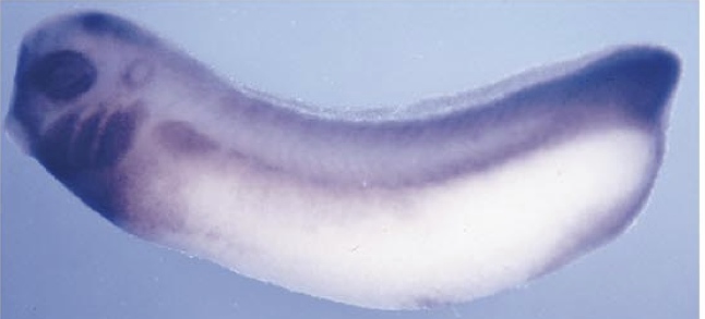 Larger Image rps3a (ribosomal protein S3A) gene expression in Xenopus laevis embryo, assayed via in situ hybridization, NF stage 29 &30 , lateral view, anterior left, dorsal up. Image published in: Wischnewski J et al. (2000) Copyright © 2000. Image reproduced with permission of the Publisher, Elsevier B. V.