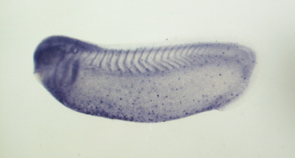 Larger Image prtn3 (proteinase 3) gene expression in Xenopus laevis embryo, assayed via in situ hybridization, NF stage 27, lateral view, anterior left, dorsal up. Copyright © Patient Lab Image created by: Aldo Ciau-Uitz