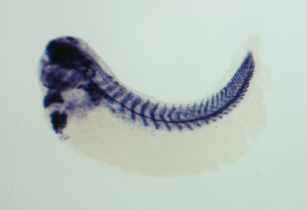 Larger Image jag2 (jagged 2) gene expression in Xenopus laevis embryo, assayed via in situ hybridization, NF stage 35 & 36, lateral view, anterior left, dorsal up. Copyright © Patient Lab Image created by: Aldo Ciau-Uitz