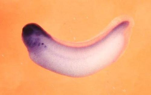 Larger Image b9d1 (B9 protein domain 1) gene expression in Xenopus laevis embryo, assayed via in situ hybridization, NF stage 33 & 34, lateral view, anterior left, dorsal up. Copyright © Patient Lab Image created by: Aldo Ciau-Uitz