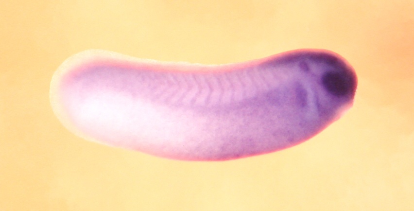 Larger Image wtap (Wilms tumor 1 associated protein) gene expression in Xenopus laevis embryo, assayed via in situ hybridization, NF stage 26, anterior right, dorsal up. Copyright © Patient Lab Image created by: Aldo Ciau-Uitz