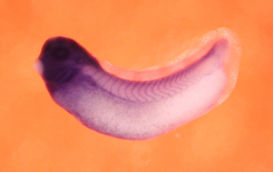 Larger Image elf2 (E74-like factor 2 (ets domain transcription factor)) gene expression in Xenopus laevis embryo, assayed via in situ hybridization, NF stage 31, lateral view, anterior left, dorsal up. Copyright © Patient Lab Image created by: Aldo Ciau-Uitz