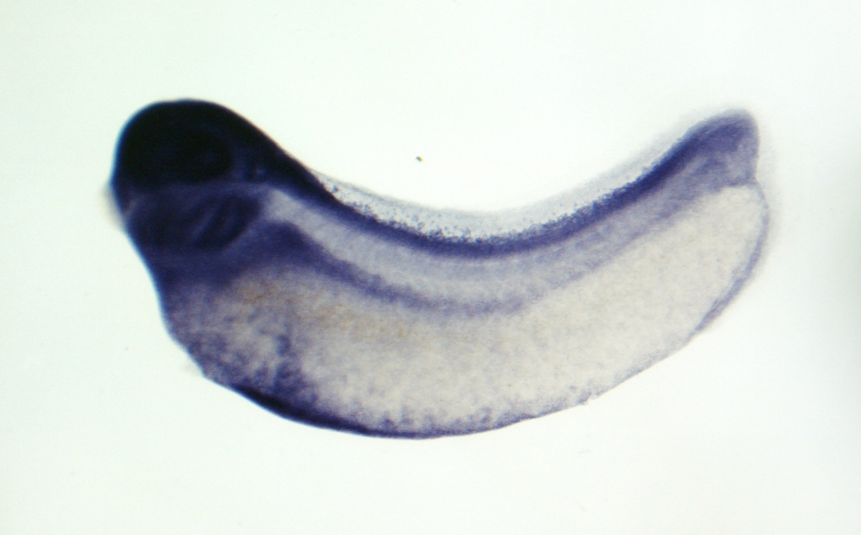 Larger Image nfya (nuclear transcription factor Y, alpha) gene expression in Xenopus laevis embryo, assayed via in situ hybridization, NF stage 31, lateral view, anterior left, dorsal up. Copyright © Patient Lab Image created by: Aldo Ciau-Uitz