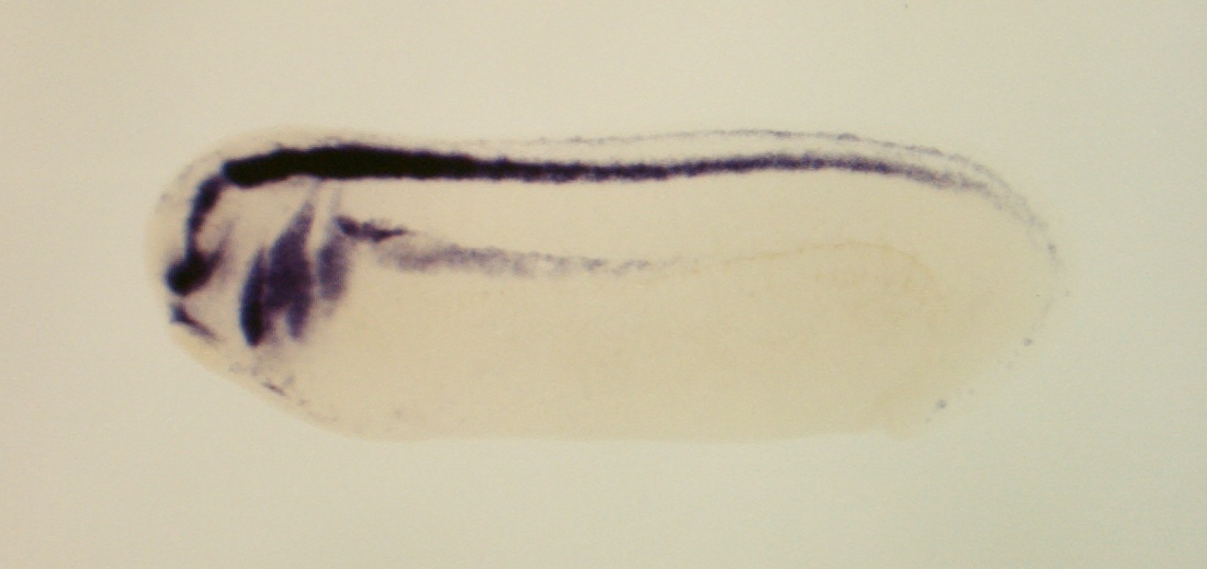Larger Image robo4 (roundabout, axon guidance receptor, homolog 4) gene expression in Xenopus laevis embryo, assayed via in situ hybridization, NF stage 26, lateral view, anterior left, dorsal up. Copyright © Patient Lab Image created by: Aldo Ciau-Uitz
