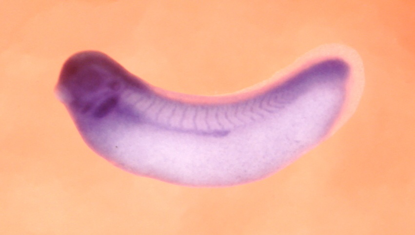 Larger Image jarid2 (jumonji, AT rich interactive domain 2) gene expression in Xenopus laevis embryo, assayed via in situ hybridization, NF stage 29 and 30, lateral view, anterior left, dorsal up. Copyright © Patient Lab Image created by: Aldo Ciau-Uitz