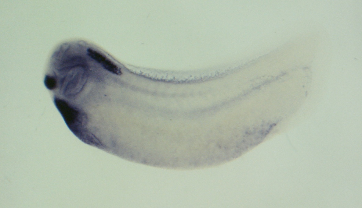 Larger Image tbx20 (T-box 20) gene expression in Xenopus laevis embryo, assayed via in situ hybridization, NF stage 31, lateral view, anterior left, dorsal up. Copyright © Patient Lab Image created by: Aldo Ciau-Uitz