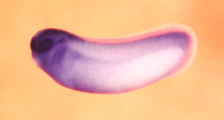 Larger Image yy1 (YY1 transcription factor) gene expression in Xenopus laevis embryo, assayed via in situ hybridization, NF stage 30, lateral view, anterior left, dorsal up. Copyright © Patient Lab Image created by: Aldo Ciau-Uitz