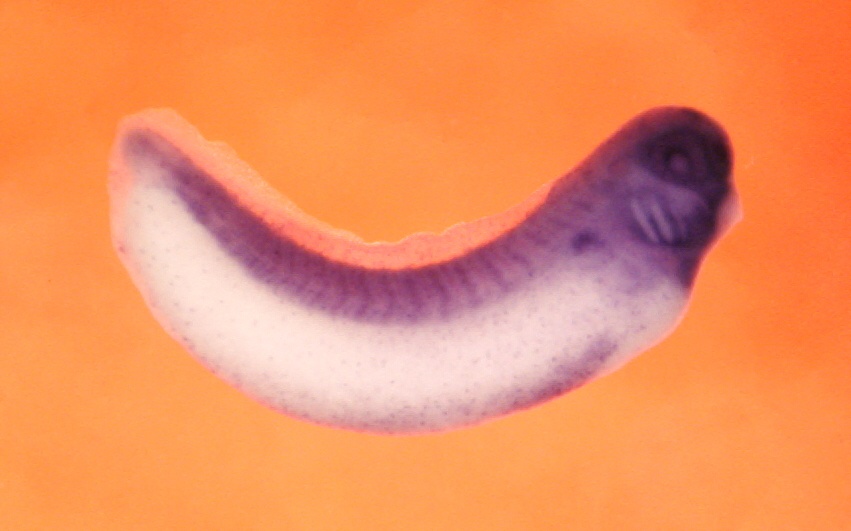 Larger Image stom (stomatin) gene expression in Xenopus laevis embryo, assayed via in situ hybridization, NF stage 31, lateral view, anterior right, dorsal up. Copyright © Patient Lab Image created by: Aldo Ciau-Uitz