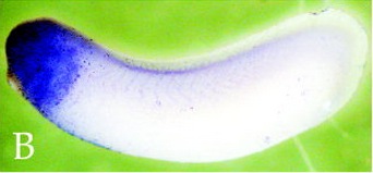 Larger Image sox18 (SRY-box 18) gene expression in Xenopus laevis embryo, assayed via in situ hybridization, NF stage 28, lateral view, anterior left, dorsal up. This image is extracted from figure published in: Zhang C et al. (2005), Image published in: Zhang C et al. (2005) Copyright © 2005. Image reproduced with permission of the Publisher, John Wiley & Sons.