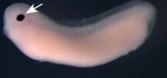 Larger Image cryba1 (crystallin beta A1) gene expression in Xenopus laevis embryo, assayed via in situ hybridization, NF stage 29 & 30, lateral view, anterior left, dorsal up. Image published in: Day RC and Beck CW (2011) Copyright ©2011 Day and Beck; licensee BioMed Central Ltd. Creative Commons Attribution license