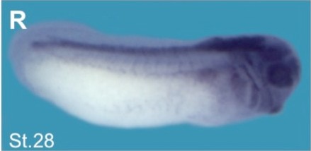 Larger Image numbl (numb homolog-like) gene expression in Xenopus tropicalis embryo, assayed via in situ hybridization, NF stage 28, lateral view, anterior right, dorsal up. This image is extracted from figure published in: Nieber F et al. (2013), Image published in: Nieber F et al. (2013) Copyright © 2013 Nieber et al. Creative Commons Attribution license