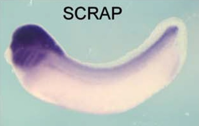 Larger Image srcap (Snf2-related CREBBP activator protein) gene expression in Xenopus laevis embryo, assayed via in situ hybridization, NF stage 28, lateral view, anterior left, dorsal up. This image is extracted from figure published in: Linder B et al. (2004), Image published in: Linder B et al. (2004) Copyright © 2004. Image reproduced with permission of the Publisher, Elsevier B. V.