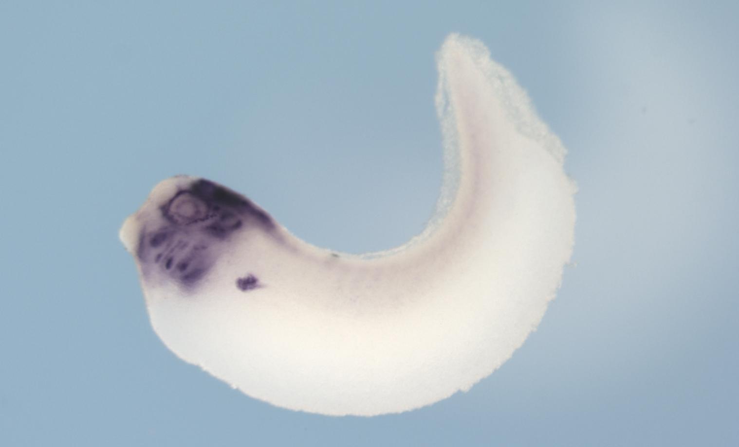 Larger Image irx2 (iroquois homeobox 2) gene expression in Xenopus laevis embryo, assayed via in situ hybridization, NF stage 33 & 34, lateral view, anterior left, dorsal up. Copyright © Soeren S Lienkamp Image created by: Soeren S Lienkamp
