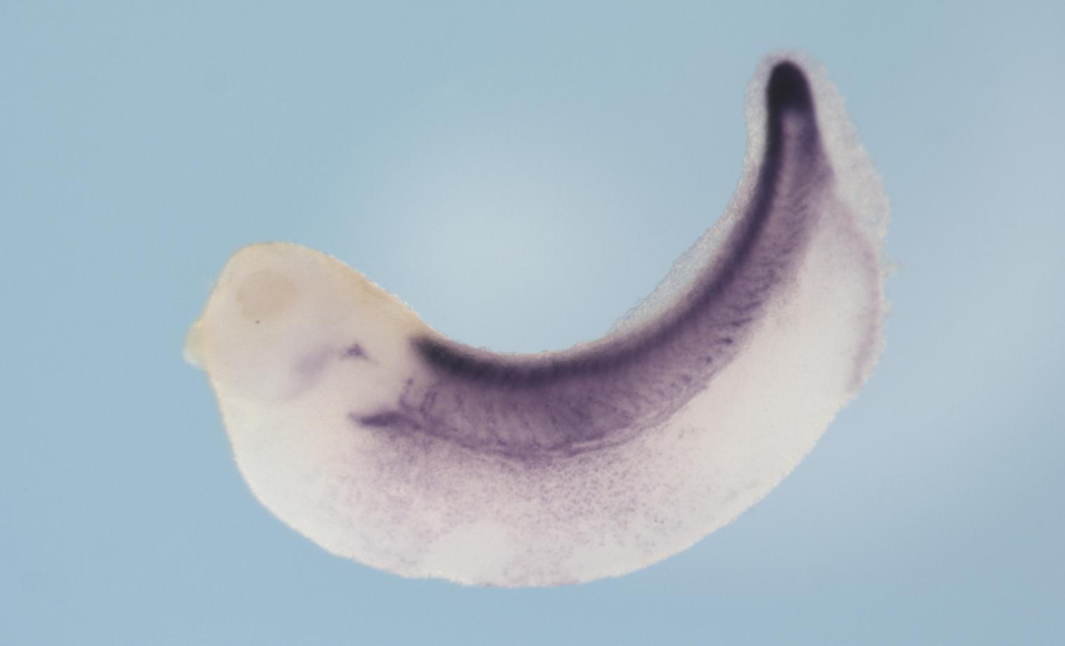 Larger Image hoxc6 (homeobox C6) gene expression in Xenopus laevis embryo, assayed via in situ hybridization, NF stage 33 & 34, lateral view, anterior left, dorsal up. Copyright © Soeren S Lienkamp Image created by: Soeren S Lienkamp