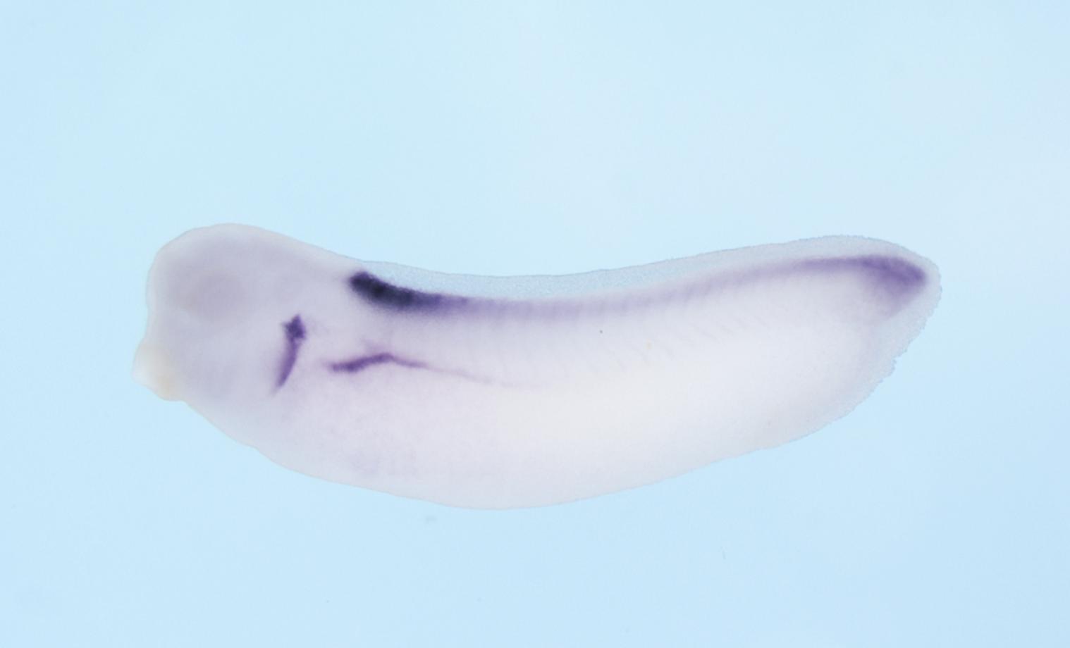 Larger Image hoxc5 (homeobox C5) gene expression in Xenopus laevis embryo, assayed via in situ hybridization, NF stage 28, lateral view, anterior left, dorsal up. Copyright © Soeren S Lienkamp Image created by: Soeren S Lienkamp