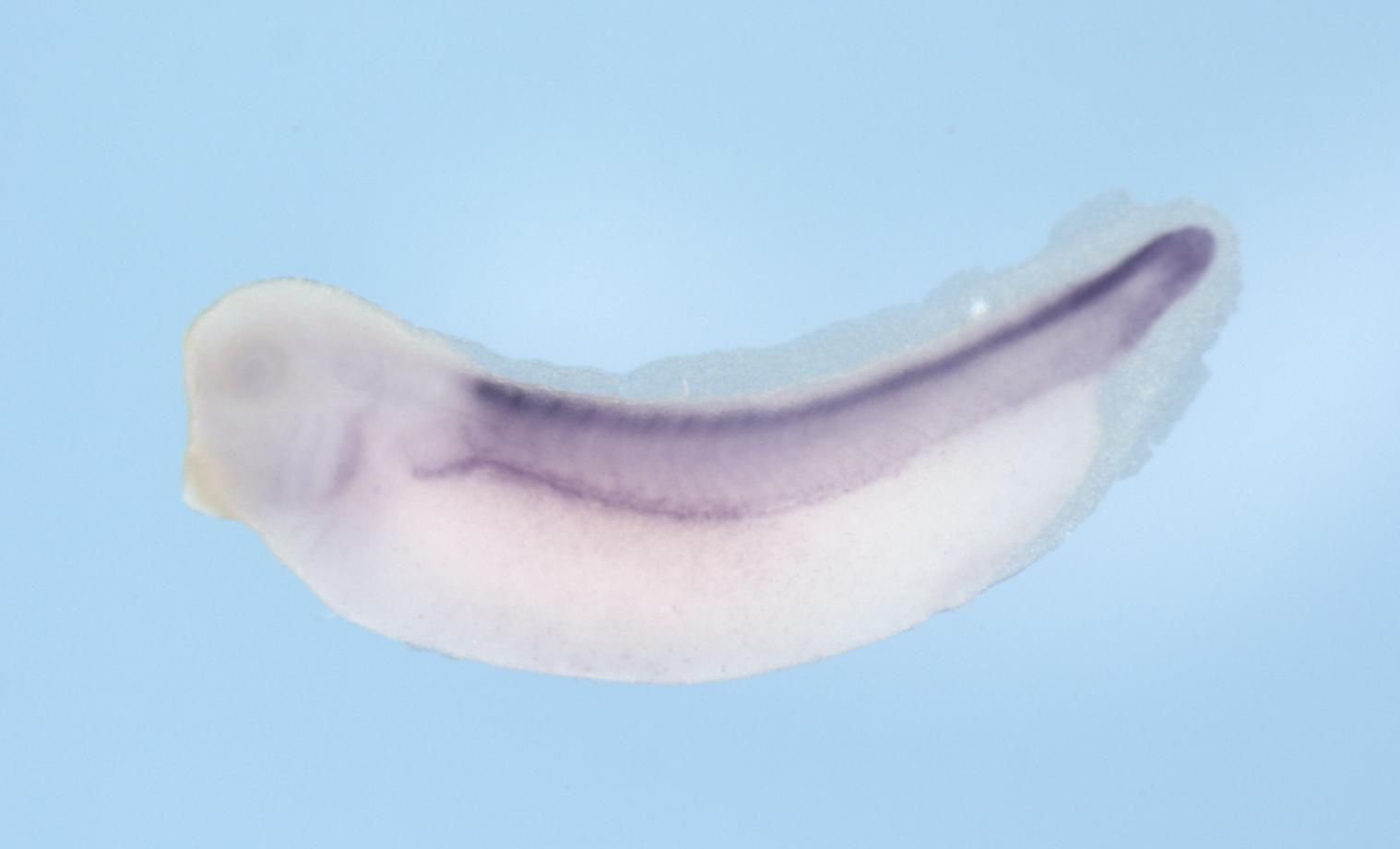 Larger Image hoxb6 (homeobox B6) gene expression in Xenopus laevis embryo, assayed via in situ hybridization, NF stage 33 & 34, lateral view, anterior left, dorsal up. Copyright © Soeren S Lienkamp Image created by: Soeren S Lienkamp