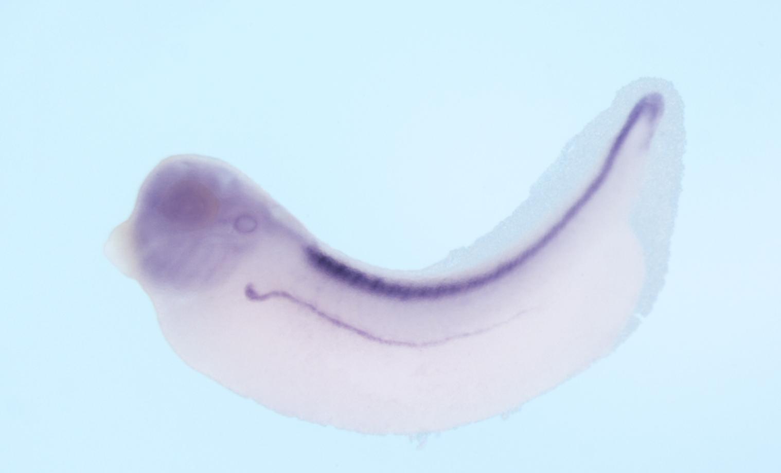 Larger Image hoxb7 (homeobox B7) gene expression in Xenopus laevis embryo, assayed via in situ hybridization, NF stage 33 & 34, lateral view, anterior left, dorsal up. Copyright © Soeren S Lienkamp Image created by: Soeren S Lienkamp