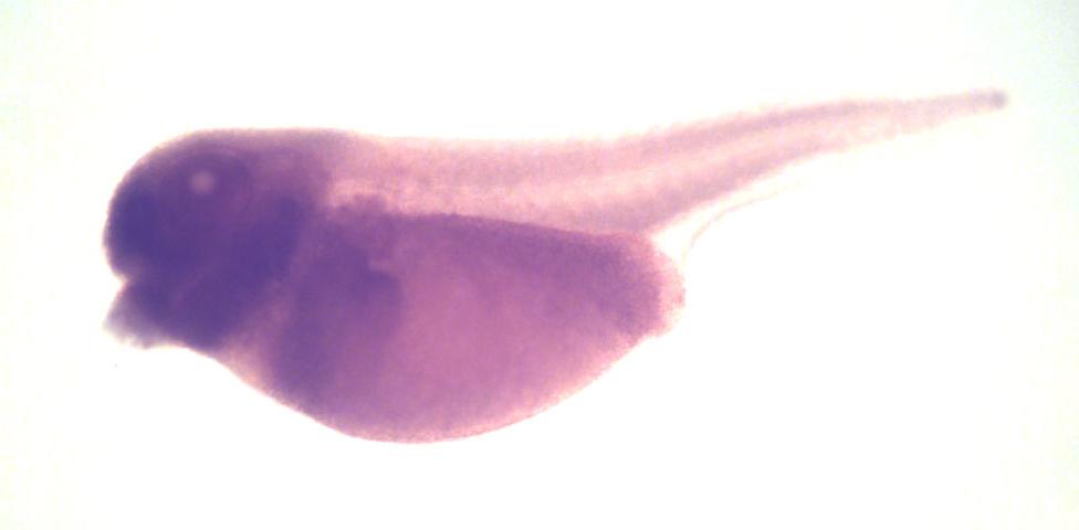 Larger Image atf7ip (activating transcription factor 7 interacting protein) gene expression in X. laevis embryo, assayed via in situ hybridization, NF stage 37 & 38, lateral view, anterior left, dorsal up. Copyright © Perron Lab