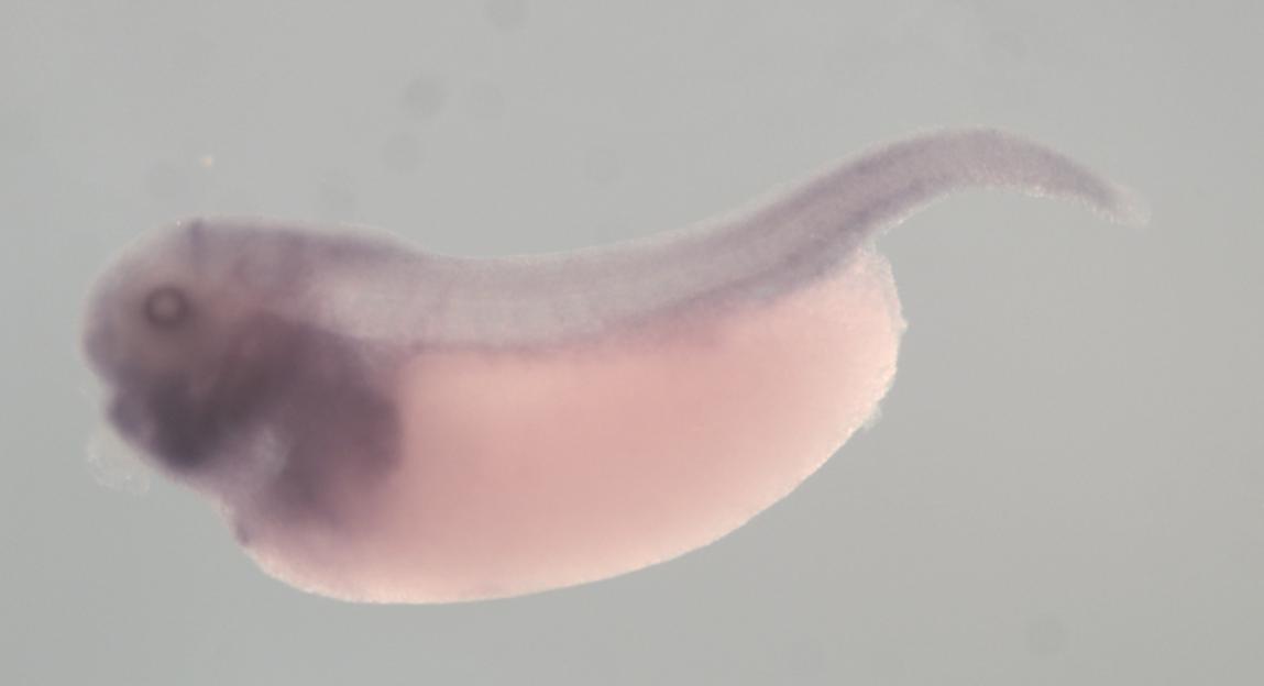 Larger Image grik5 (glutamate receptor, ionotropic, kainate 5) gene expression in X. laevis embryo, assayed via in situ hybridization, NF stage 35 & 36, lateral view, anterior left, dorsal up. Copyright © Perron Lab