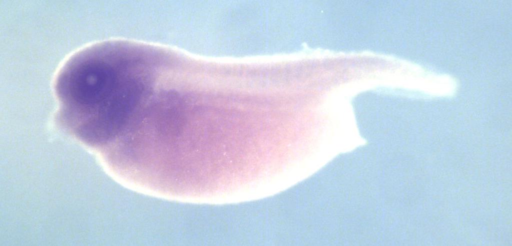 Larger Image trappc8 (trafficking protein particle complex 8) gene expression in X. laevis embryo, assayed via in situ hybridization, NF stage 35 & 36, lateral view, anterior left, dorsal up. Copyright © Perron Lab