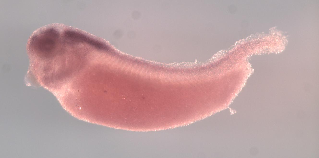 Larger Image matcap1 (microtubule associated tyrosine carboxypeptidase 1) gene expression in X. laevis embryo, assayed via in situ hybridization, NF stage 33 & 34, lateral view, anterior left, dorsal up. Copyright © Perron Lab