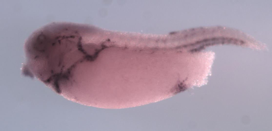 Larger Image plxna4 (plexin A4) gene expression in X. laevis embryo, assayed via in situ hybridization, NF stage 35 & 36, lateral view, anterior left, dorsal up. Copyright © Perron Lab