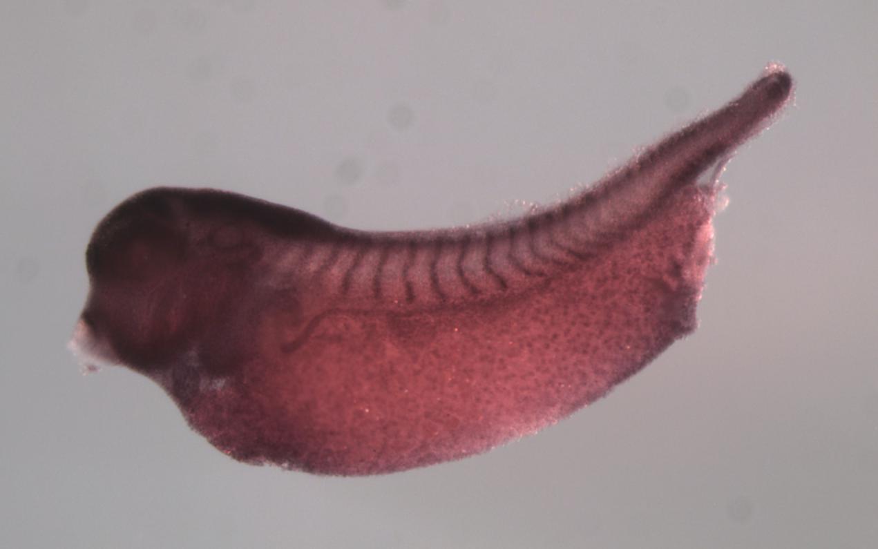 Larger Image matcap2 (microtubule associated tyrosine carboxypeptidase 2 ) gene expression in X. laevis embryo, assayed via in situ hybridization, NF stage 35 & 36, lateral view, anterior left, dorsal up. Copyright © Perron Lab