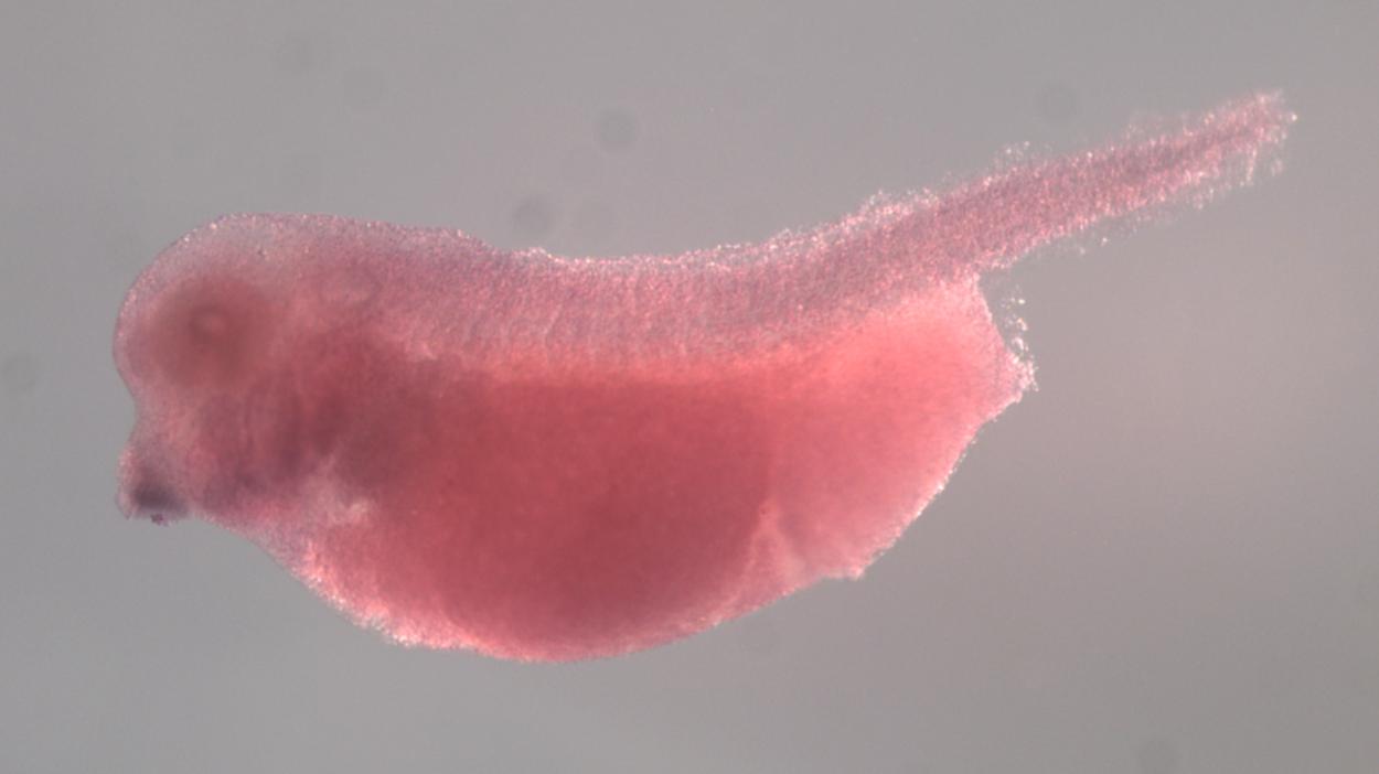 Larger Image ankrd17 (ankyrin repeat domain 17) gene expression in X. laevis embryo, assayed via in situ hybridization, NF stage 35 & 36, lateral view, anterior left, dorsal up. Copyright © Perron Lab