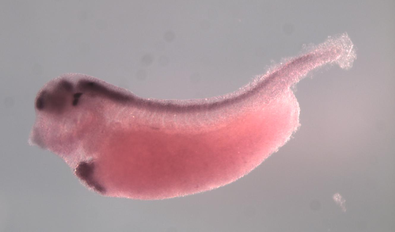 Larger Image sarm1 (sterile alpha and TIR motif containing 1) gene expression in X. laevis embryo, assayed via in situ hybridization, NF stage 35 & 36, lateral view, anterior left, dorsal up. Copyright © Perron Lab