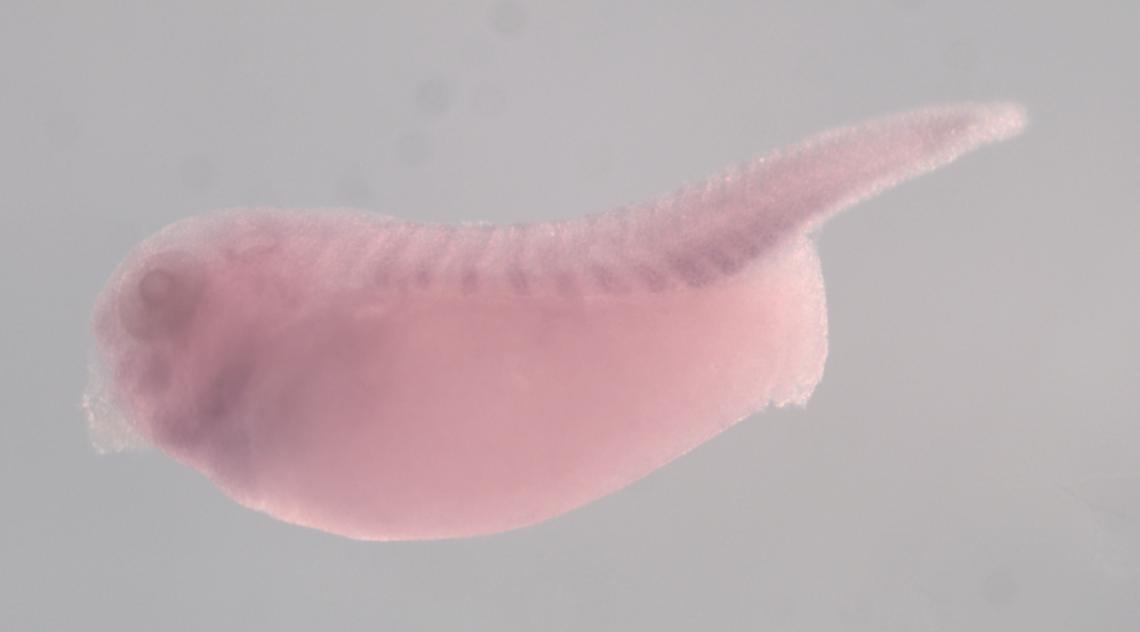 Larger Image pcdh11x (protocadherin 11 X-linked ) gene expression in X. laevis embryo, assayed via in situ hybridization, NF stage 35 & 36, lateral view, anterior left, dorsal up. Copyright © Perron Lab