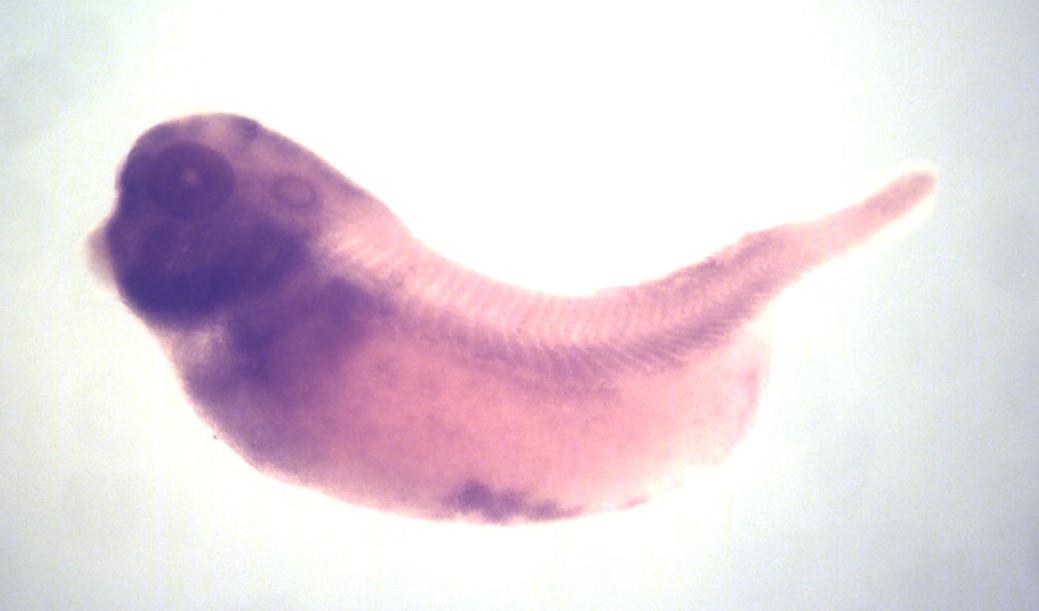 ncdn (neurochondrin) gene expression in X. laevis embryo, assayed via in situ hybridization, NF stage 35 & 36, lateral view, anterior left, dorsal up.